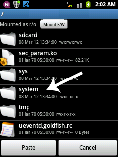 3.8) If you notice here the file system is 'r/o' (Read Only) permission. So we can't paste or copy any files in 'system' folder when it is in r/o permission. So Tap the 'Mount R/W' button just near the 'r/o'. If you do it Correctly the file system is now 'r/w' (Read Write) permission.